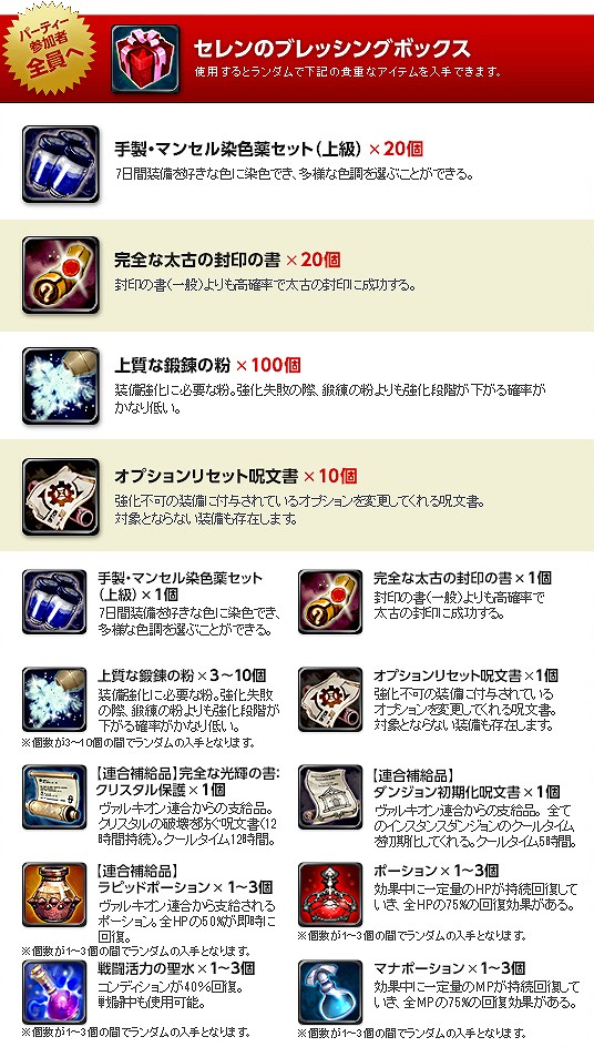 イベント期間中に対象のインスタンスダンジョン内の最終ボスモンスターを倒した際に「セレンのブレッシングボックス」がドロップされます。「セレンのブレッシングボックス」を使用すると、以下のアイテムを入手することができます。