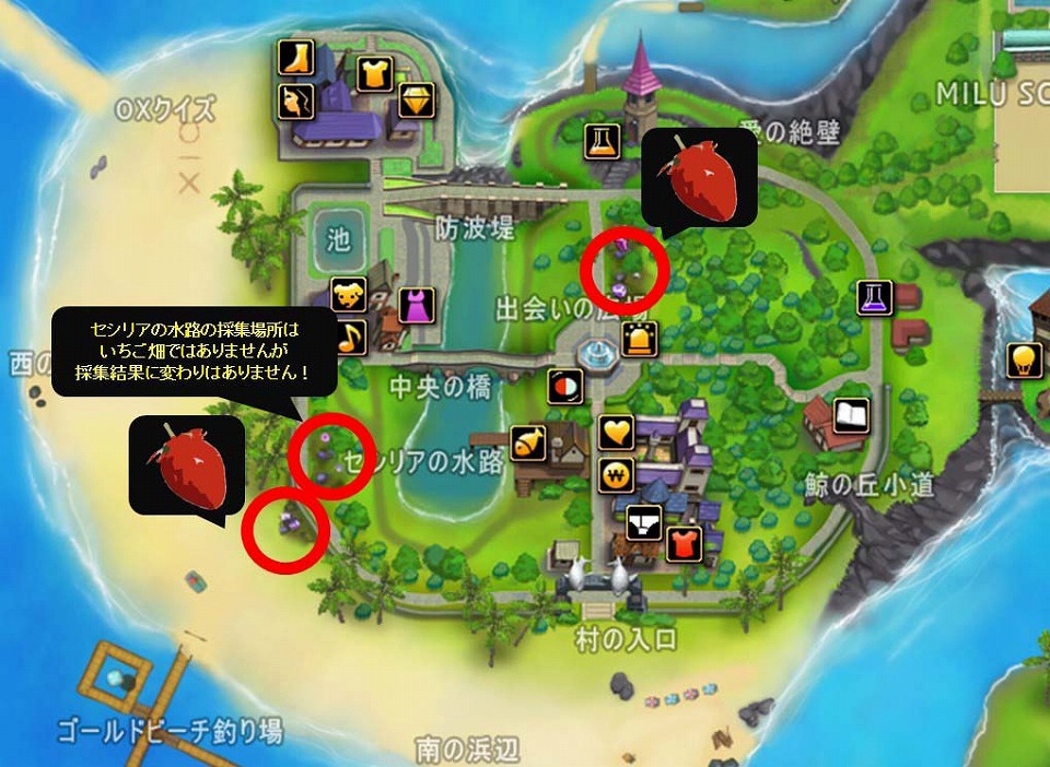 今週から白ひげ鯨村に、いちご畑が設置されました。いちごの採集の際に獲得出来るスプリングカプセルを使用し、イベントアイテムや材料アイテムをGET できます。お友達と一緒に、楽しい春の思い出を作ってみてください。以下のマップを参考にして、いちご狩りに挑戦してみましょう。