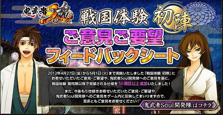2012年4月27日(金)から5月1日(火)まで実施いたしました、「鬼武者Soul」初のテストプレイ「戦国体験 初陣」では、事前の予想を上回る多くの方々にご試遊いただきました。このたび、「戦国体験 初陣」でお寄せいただきましたプレイヤーの皆様からのご意見・ご要望や、鬼武者Soul開発隊へのご意見を基に、「戦国体験 第弐陣」で実装される項目が決定いたしました。ゲーム全般の操作環境から内政・合戦コマンドまで、ゲーム内のすべての機能にわたって50項目以上の改善を実施しております。