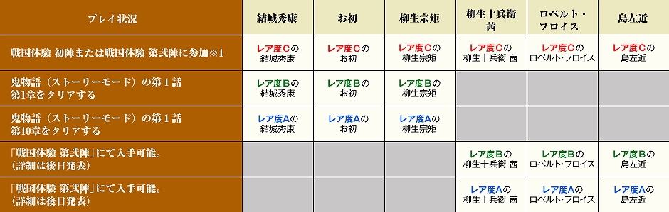 ※1 戦国体験の実施期間中、一度でもゲームにログインした方が対象となります。初陣/第弐陣のプレイ状況によっては、レア度C、B、Aと能力値の異なる3種類の武将を手に入れることが可能です。