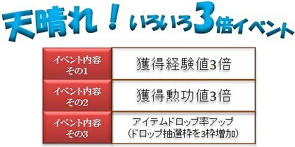 なんとイベント期間中、獲得経験値3倍、獲得勲功値3倍、アイテムドロップ率UPの超豪華内容にてお届け!これまでの仲間、又はまだ見知らぬ新しいお友達と一緒に、思いっきりキャラクター育成に励んでみてください。