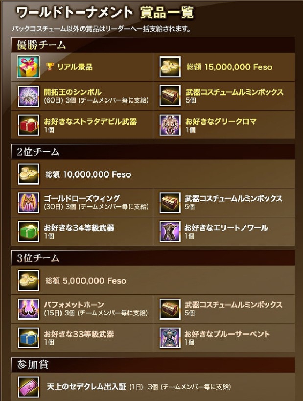 優勝チーム所属各家門・選手には、ゲーム内第三通貨である、Feso で総額15,000,000Fesoを始めとする素敵な賞品と共に、特製「優勝トロフィー」が贈られます!