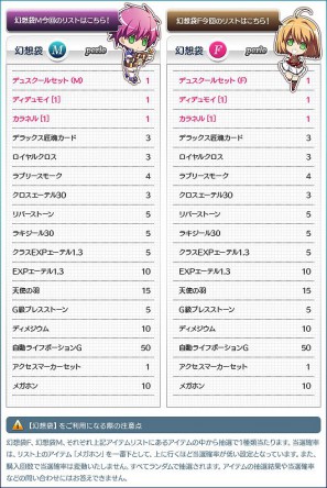 アイテムモールに「幻想袋emeraude」の販売が終了し、新たに「幻想袋perle」の販売を開始しました。今回の大当たりは、爽やかさと元気がいっぱいの「デュスクールセット」です。また、キャラクターの星座によって真価を発揮する輝く頭装備「ディデュモイ」と、背装備「カラネル」も新登場。その他にも、様々な便利なアイテムが手に入るチャンスとなっておりますので是非ご利用下さい。