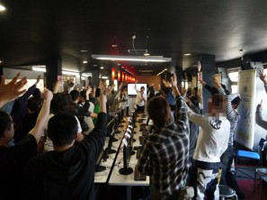 イベント特設会場として、ビリヤードコーナーにハイスペックPC18台とMCタナベとMCアオキ専用PC2台を設置。集まったユーザーもいつもと違うネットカフェの雰囲気が新鮮だったようだ。