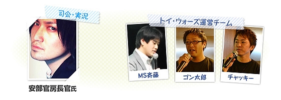 司会・実況は、「トイ・ウォーズDE遊ばナイト☆」やイベントでお馴染みの「安部官房長官」氏が担当!そしてトイ・ウォーズ運営チームからは、「MS斉藤」、「ゴン太郎」、「チャッキー」が出撃予定です!