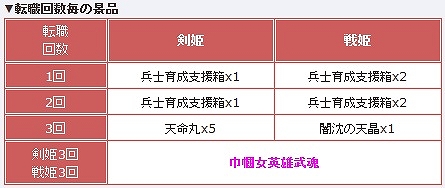 イベント期間中、日本オリジナル兵士第1弾「剣姫」、または「戦姫」へ転職した回数によって、「兵士育成支援箱」や「天命丸」など、兵士育成に便利なアイテムをプレゼントいたします。見事「剣姫」と「戦姫」を3回転職した方には、初披露となる使用期限が永久の「巾幗女英雄武魂」をプレゼント!