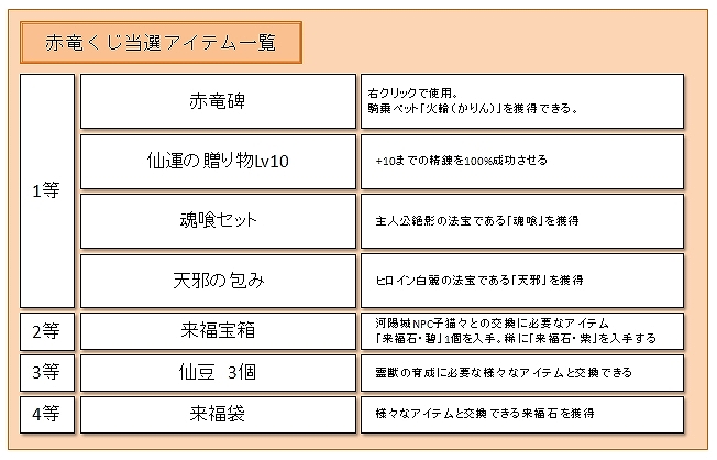本日のアップデートにて、追加された「赤竜くじ」を20個購入毎に、夢幻宝箱・鉄を1個、もれなくプレゼント!さらに!「赤竜くじ」を50個購入毎に、来福宝箱を1個、もれなくプレゼントいたします。
