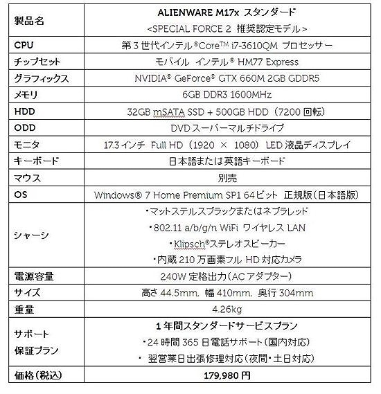 デルは、「SPECIAL FORCE2(スペシャルフォース2)」を本格志向で楽しめる「SF2推奨認定モデル」として、「ALIENWARE M17x」スタンダードモデルの販売を、オンライン、店頭、電話の各直販サイトにて販売開始した。