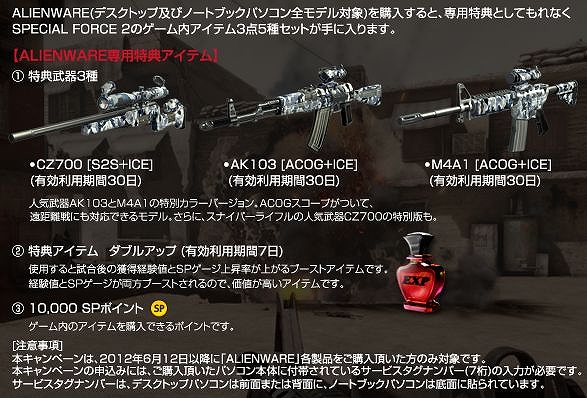 「ALIENWARE M17x」の「SF2推奨認定モデル」発売を記念し、「ALIENWARE」デスクトップまたはノートブックパソコンのいずれかのモデルを購入すると、専用特典としてもれなく「SF2」ゲーム内アイテム3点5種セットを手に入れることができます。