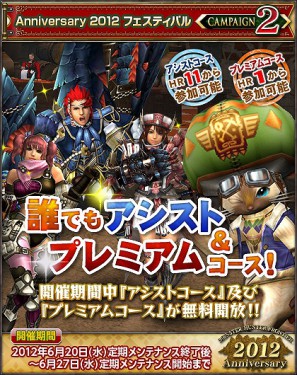 「Anniversary 2012 フェスティバル」10 大キャンペーンのひとつ、「誰でもアシスト&プレミアムコース!」が開催中です。期間中は、すべてのハンターの皆さまに「アシストコース」と「プレミアムコース」が自動的に無料で付与されます!!
