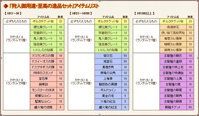 「ポルタチケット桜」20枚に加えて、下記のリストのカテゴリA から1種、カテゴリB から5種のアイテムがランダムで選択され、入手できます。カテゴリA・B の内容は、イベントコード入力時のハンターランク(HR)によって異なります。