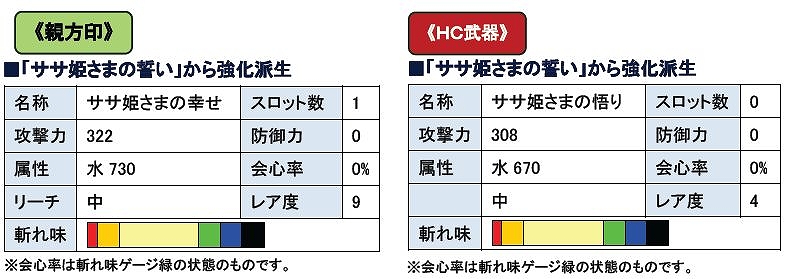 配信されるクエストをクリアすると、イベントオリジナル武器「ササ姫さまの涙」(片手剣)の生産素材や≪親方印武器≫≪HC 武器≫への強化素材を入手することが可能です。