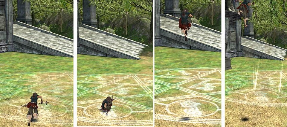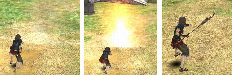 前方へ転んだ後、跳躍し多数の短剣を投擲して短槍で地面を突き刺して仕上げる。