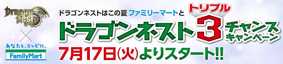NHN Japanは、「ドラゴンネスト」において、ファミリーマートとのタイアップ「ドラゴンネスト3チャンスキャンペーン」と、公認ネットカフェとのコラボキャンペーンを同時開催する。