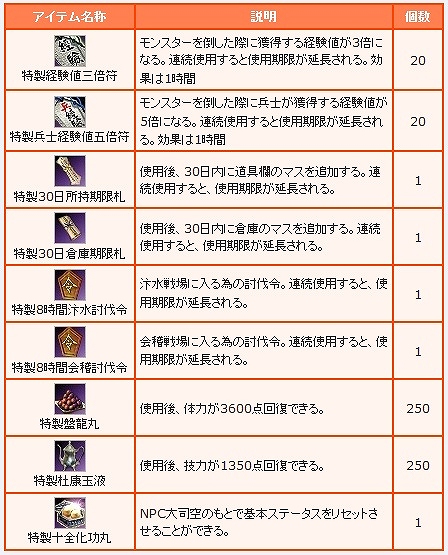 - バフ効果: 獲得経験値3倍、兵士獲得経験値3倍、攻撃力+50、武将技攻+50、防御力+50、武将技防+50