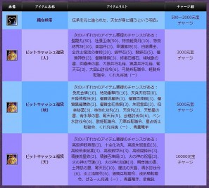 キャンペーン期間中、「ビットキャッシュ」を利用して、ゲーム内通貨「元宝」をチャージして頂いた方にご購入金額に応じて、ゲーム内アイテム「ビットキャッシュ福袋」、もしくは「織女緞帯」をプレゼント。