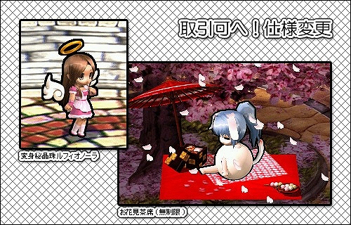過去に登場したアイテム「変身秘晶珠ルフィオノーラ」と「お花見茶席(無制限)」は、2012年7月18日(水)よりプレイヤー同士への取引が可能になりました。