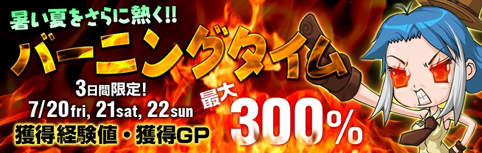 - 7月20日(金)15:00~18:59 獲得経験値が300%にアップ (3倍)