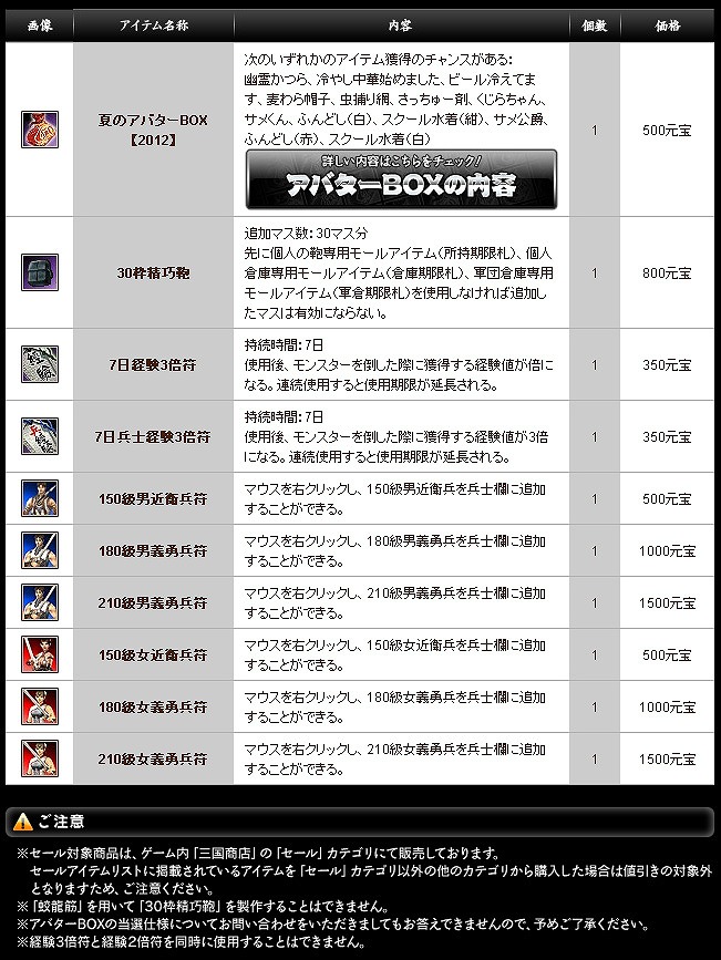 セール期間中、アイテムモール「三国商店」に期間限定特別商品「夏のアバターBOX【2012】」が新たに登場。