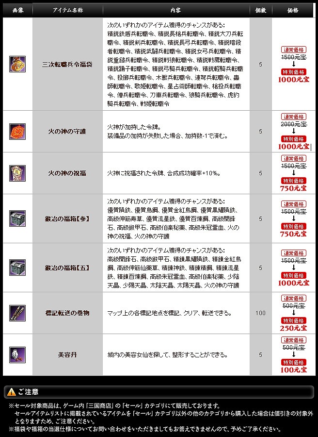 セール期間中、アイテムモール「三国商店」の人気アイテムが期間限定で大幅に値下げ!日本オリジナル兵士「戦姫」の転職令が当たる「三次転職兵令福袋」や精錬に欠かせない「火の神の祝福」等、販売ランキング上位のアイテムを厳選し、特別価格でご提供いたします。