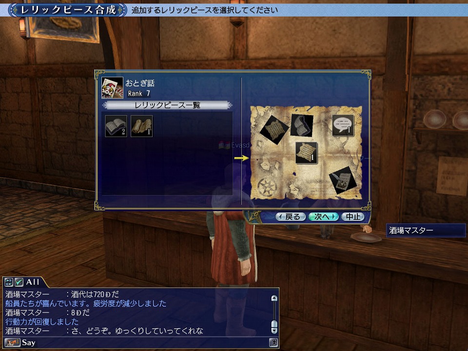 レリックピースが集まったら、酒場で分析しましょう。レリックピースを合成することで分析が進み、レリックに関する情報が徐々に明らかになっていきます。