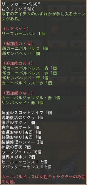 「リーフカーニバルCP」【女性用・男女共用】を使用すると、以下のアイテムのいずれかが手に入るチャンスがあります。