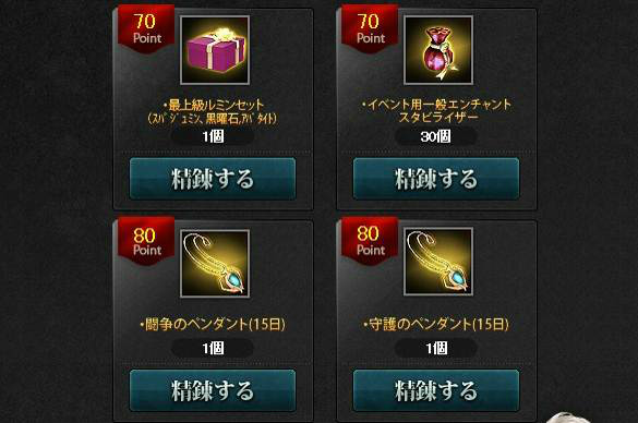 ※「精錬する」ボタンが「長期精錬する」になっているアイテムについては、イベント終了後、同アイテムに対して「長期精錬する」を押したユーザーの中から抽選で支給されます。