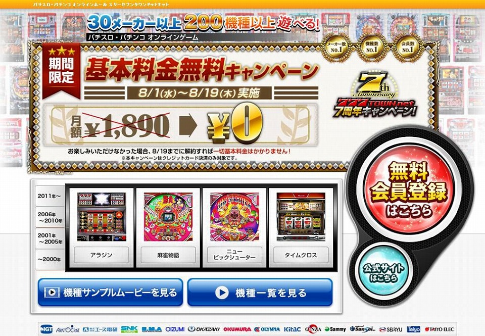 サミーネットワークスは、「777タウン.net」において、サービス開始7周年を記念して!「期間限定!基本料金無料キャンペーン」を開催する。