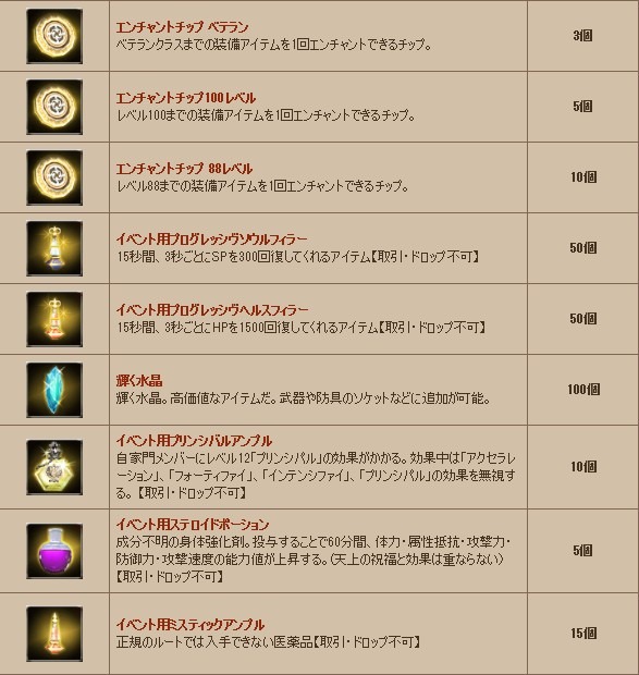 リニューアルされてから、新規さん、休眠さんに続き、最後のプレゼント支給となりましたが、どうぞ冒険にお役立てください。