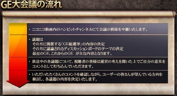 ついにリニューアルの目玉である「GE 大会議」が 8月 4日(土)に生放送されます。 “開かれた運営”を掲げた先日のリニューアル発表にのっとり、ユーザーさんからの意見を伺いながら、 ゲーム内バランスを調整。会議では、 運営の考えや方針を “顔が見える形で”公開していきます。