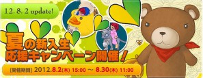 夏の新入生を応援!キャンペーン期間中に新規登録を行い、キャラクターレベルを30まで上げた方全員に、とっても可愛いくま型のペットをプレゼント♪さらに、キャラクターレベルを50まで上げた方全員に「Lv60相当の能力を持った乗り物・機甲」をキャンペーン終了後にプレゼントしちゃいます!