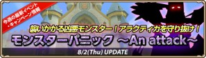 イベント中はゲーム内にて時間や場所を問わず凶悪なモンスター達が次々と現れます。また、8月3日(金)と7日(火)の2日間はさらに「An attack」と題し、特別マップにて凶悪モンスターによる大攻勢がおこなわれます。なかなか出会うことが出来ないモンスターが登場するので倒して報酬をゲットするチャンスです。数々の敵を、皆様の力を合わせてなぎ倒して下さい。