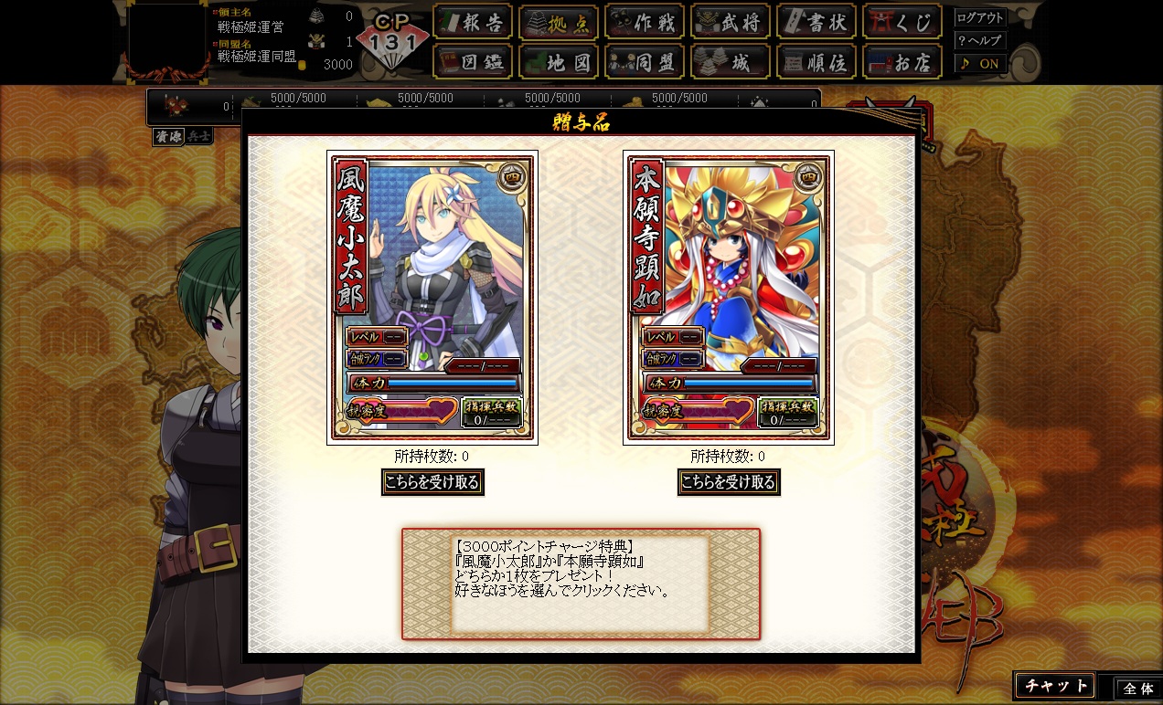 有料ポイント「ss-coin」をチャージすることで下記のプレゼントが配布されます。初回チャージ :武将「戦極茂武子」1枚3000円以上チャージ:武将「風魔小太郎」か「本願寺顕如」のいずれか1枚。