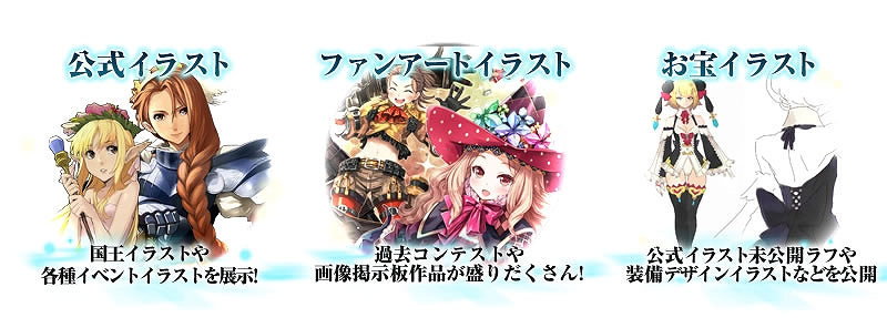 公式イラストや過去のファンアートコンテスト、画像掲示板などに投稿されたイラスト、さらには様々な装備アイテムのコンセプトアートや公式イラストのラフなど、お宝イラスト盛りだくさんのイラスト展示コーナーをご用意いたします!