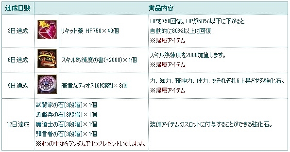 1日に2時間以上プレイされた日を達成とし、期間中に達成された日数に応じて強力な「強化石」や「スキル熟練度増加の書」をもれなくプレゼント!