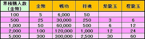 期間中の累積「金幣」チャージ数が100 金幣以上の場合、累積金幣購入数に応じて、チャージボーナスが受領可能になります。受領条件を満たしたチャージボーナスは、一度だけ受領が出来ます。