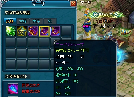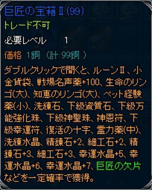 毎日開催されるイベント「戦場」の報酬に巨匠の宝箱IIが追加されます。巨匠の宝箱II :開封すると巨匠の欠片などのアイテムを入手することがあります。巨匠の欠片はミッドガルドのNPCマーサのところで各職業のLv72紫装備と交換できます。