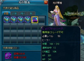 「燃焼の教堂」1FにいるNPC「光の賢者」の所で、ダンジョン内で入手可能な紫剣の欠片や紫琴の欠片、御竜盾の鱗片などのアイテムと交換してLv50の紫武器や紫防具を獲得することができます。