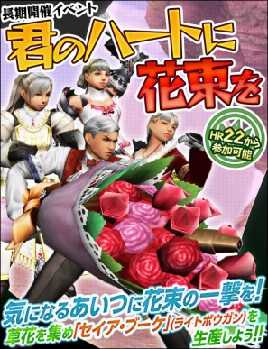 草花系の採取素材を大量に集めることで、オリジナル武器「セイア・ブーケ」、「タレイア・ブーケ」、「ヴィーナス・ブーケ」、≪親方印≫「イリス・ブーケ」、≪HC武器≫「カリス・ブーケ」(ライトボウガン)の生産素材が入手可能です。