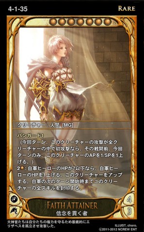 シェイクの新スキルは「バンガード」。このスキルを持つクリーチャーが自分のターンで最初に攻撃した際にAPとSPをそれぞれ1アップさせる効果がある。AP4、HP3の「信念を貫く者(左写真)」はこのバンガード持ちのクリーチャー。