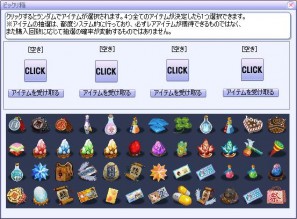ボックスを使用し、[CLICK]を押すとランダムでアイテムが選択されます(チャンスは1箱4回)。その後獲得するアイテムを4個の中から1つ選び、[アイテムを受け取る]を押して、受取りましょう(獲得可能アイテムはボックス1箱につき1つです)。