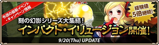 9月20日(木)より、通常時には出現機会が限定されている「刻の幻影」ボスが大量に登場する特別イベント「インパクト・イリュージョン」を開始いたしました。高性能な称号と交換できるアイテムを獲得できる強力なボスモンスターが大量に登場するチャンス期間となっておりますので、皆で協力して討ち倒してください。