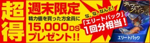 期間中、精力購入を行ったキャラクターに、後日15,000 DSをプレゼントいたします。