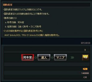 「国防長官」功績をマスターするとボーナスCRとして140,000CR、称号「国防長官」、「AK-47 Infinity(KS)」「TRG-21 Infinity(D)」の武器使用権限及び7日期限の該当アイテムが付与されます。