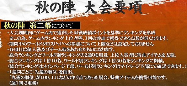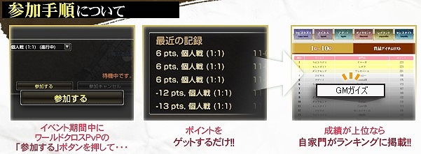 手順は簡単。期間中にPvP 参加ボタンをおしてポイントを重ねるだけだ。ランキング上位ならもちろん、キリ番にだって特典アイテムのチャンスがある。普段からPvP で遊んでいる人はもちろん、まだPvP をやったことのない人もこの機会にPvP の楽しさを味わってほしい! 武運を祈る!