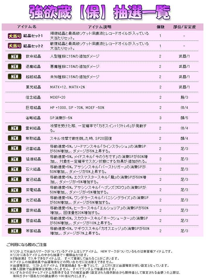 アイテムモールでは強欲蔵【永】の販売が終了し、新たに強欲蔵【保】の販売を開始いたしました。強欲蔵【保】には、ステータスによって各属性の攻撃力や防御力が上がる結晶や、特定種族へ追加ダメージが付与される結晶など、便利な結晶が手に入るチャンスとなっております。この機会に是非チャレンジしてみて下さいね!