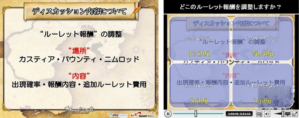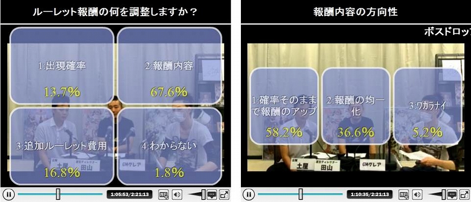 ルーレットの報酬について、ユーザーさんの意向のアンケートが放送内で行われた。この結果を参考に調整作業が進んでいく。