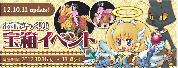 キューエンタテインメントは、「エンジェルラブオンライン」において、10月11日より「お宝ざっくり!宝箱イベント」を開催、エンジェルモールにステータス付きPDが当たる「天界の卵シリーズ」の第7弾を追加する。