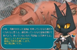 また、「鍵のかかった宝箱」はそのままでは開けることは出来ません。NPC「解錠マスター」へ「鍵のかかった宝箱」とエンジェルモールで販売されている「不思議な鍵」を持っていくことで「鍵の開いた宝箱」と交換することができます。なお、NPC「解錠マスター」へ「鍵のかかった宝箱」を持っていくと「宝箱」とも交換することができます。