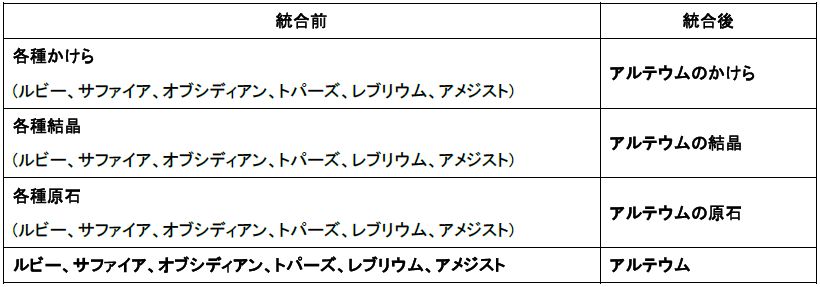 「宝玉」はクラス毎に「かけら(下級)」、「結晶(中級)」、「原石(上級)」、「(最上級)」の4種類あり、紋章生産やマジック等級以上の装備アイテム強化に使用していましたが、本アップデートにて、アルテウム系に統合され、強化しやすくなりました。